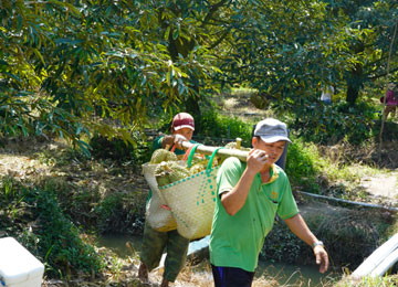 "Thủ phủ" sầu riêng Tiền Giang những ngày này nhộn nhịp cảnh nhân công vào vườn thu hoạch. Sầu riêng sau khi hái sẽ được gánh hoặc đẩy bằng xe cút kít đến điểm tập kết. Do đường quê nhỏ hẹp, sầu riêng tiếp tục được cho vào các giỏ xách, chở bằng xe máy ra đường lớn, lên xe tải về kho phân loại.